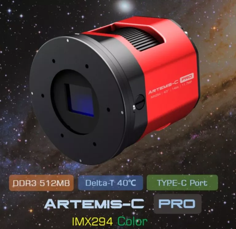 Artemis-C Pro (IMX294) 冷卻相機由頭號玩家開發,中文代號:阿爾忒彌斯,專為深空攝影進階使用者而設計,靶面達到4/3英寸,是一款高性價比產品!採用索尼IMX294  4/3″畫幅背照式彩色感光元件。4.63um像素大小, 以及65.8Ke滿阱,總像素數1170萬 (解析度4144*2824),對角線23.2mm。
