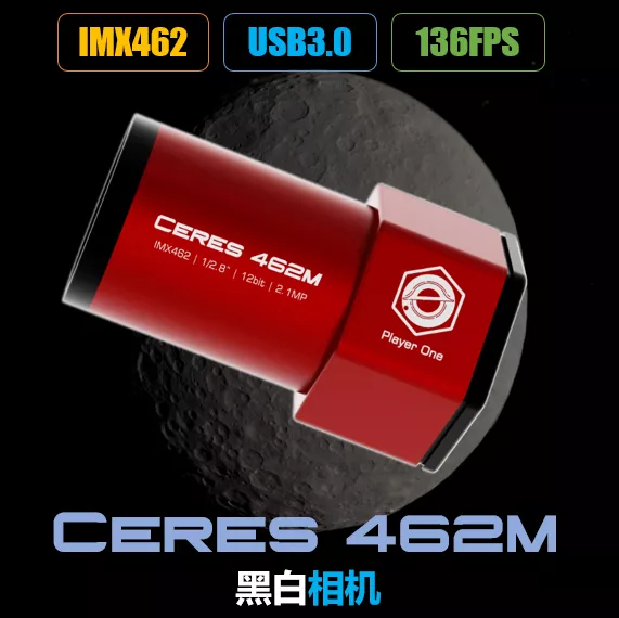 Ceres 462M 是由 Player One Astronomy 開發的導星相機,採用 SONY IMX462 1/2.8″ 格式感測器。2.9um 的像素尺寸可容納 12ke 阱深,總像素為 210 萬像素(解析度為 1944*1096),對角線為 6.5mm。