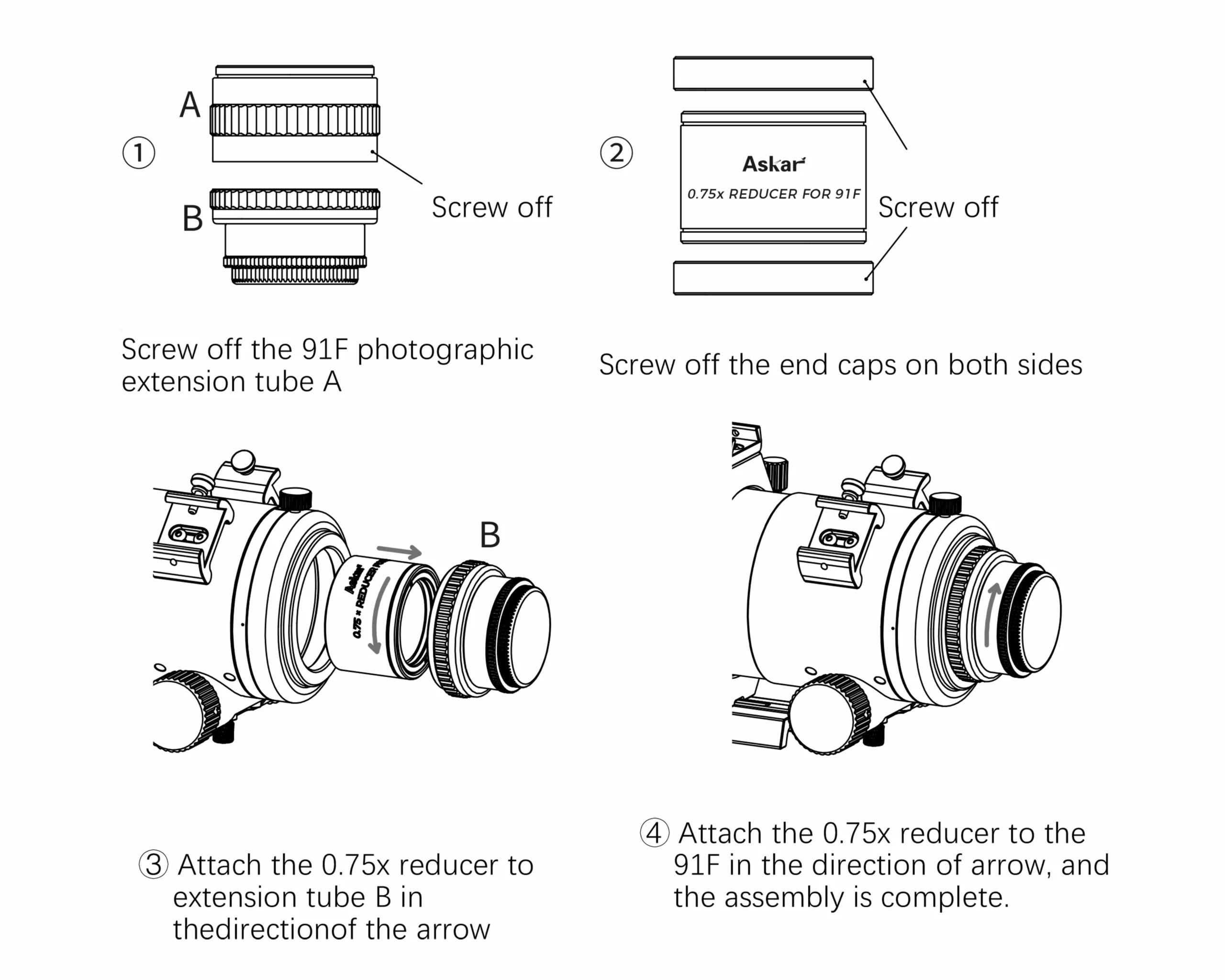 Askar 91F 0.75x減焦鏡採用三片式光學設計,支援全片幅相機拍攝。其後截距為55mm(自M48螺紋端面起算),兩端介面均為M59×1螺紋。 91F拍攝延長管上配有M54*0.75以及M48*0.75兩種尺寸接環,可直接連接於91F 0.75x減焦鏡上使用,接駁方便。減焦鏡後端接環內建M48×0.75 2吋濾鏡螺紋,方便直接安裝濾鏡。減焦鏡整體採用CNC精密加工,並配備前後金屬螺紋端蓋,方便收納時防塵保護。