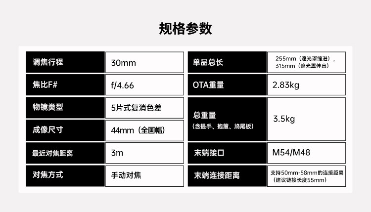 自平場設計大幅簡化拍攝流程,無需額外計算後截距或購買平場鏡,50-58mm連接距離均可輕鬆合焦(建議55mm)。