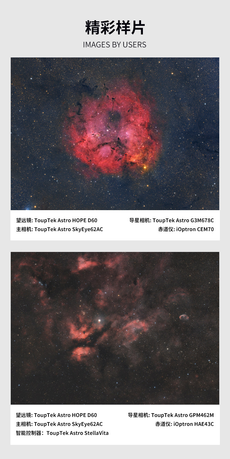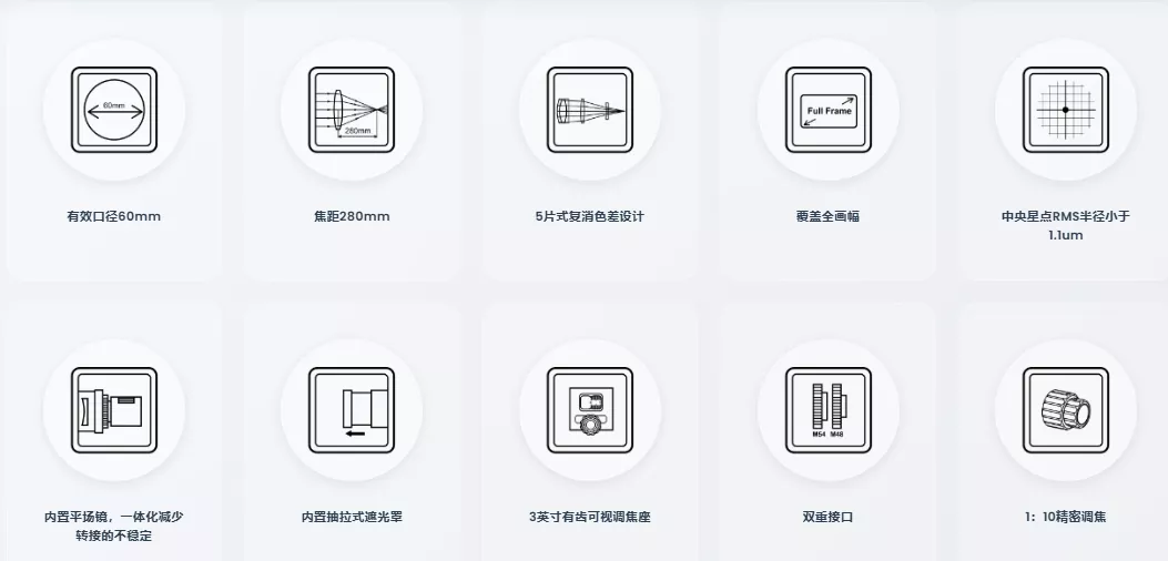 原生平場設計 原生平場設計涵蓋全片幅 全域星點清晰銳利 原生平場校正像面彎曲,確保中央與邊緣星點精準聚焦,畫質更清晰、星點更圓潤。 自平場設計大幅簡化拍攝流程,無需額外計算後截距或購買平場鏡,50-58mm連接距離均可輕鬆合焦(建議55mm)。 註:由於望遠鏡對焦平面位置和工作距已經過精密設計,因而不建議使用天頂鏡進行目視觀測。