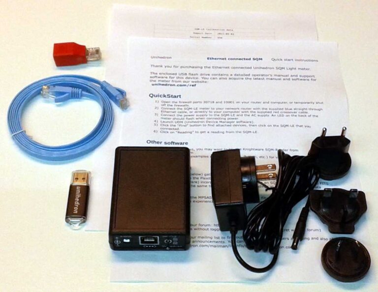 An ethernet-enabled SQM model for night-time sky brightness monitoring! An affordable meter for continual, connected measuring of sky brightness for astronomers! The "Sky Quality Meter - LE" measures the brightness of the night sky in magnitudes per square arcsecond. Designed by Dr. Doug Welch and Anthony Tekatch Uses: